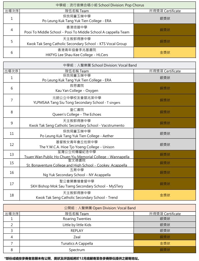中學組:流行音樂合唱小組、中學組:人聲樂團及公開組:人聲樂團(國際)總分最高之前三組參賽隊伍,將依次獲得